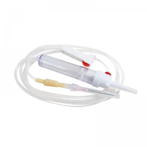 The disposable blood transfusion set is designed for safe and efficient IV transfusions. It features a sharp spike, drip chamber, air vent, and flexible tubing.